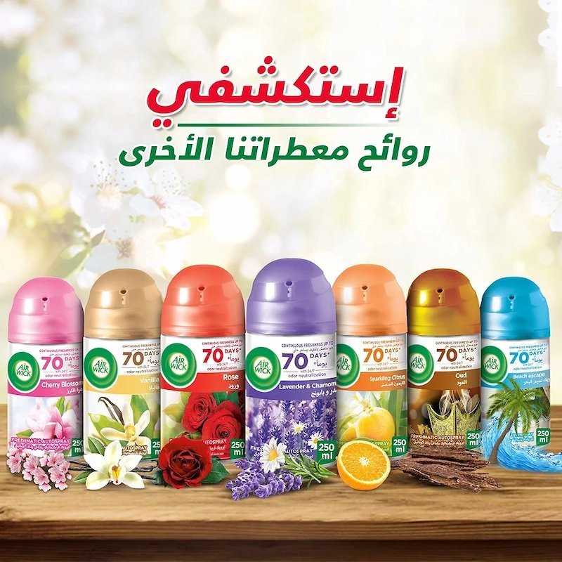 Profitez d’un parfum délicat de fleurs de cerisier dans votre maison avec le diffuseur Air Wick Freshmatic et sa recharge pour 70 jours de fraîcheur continue.