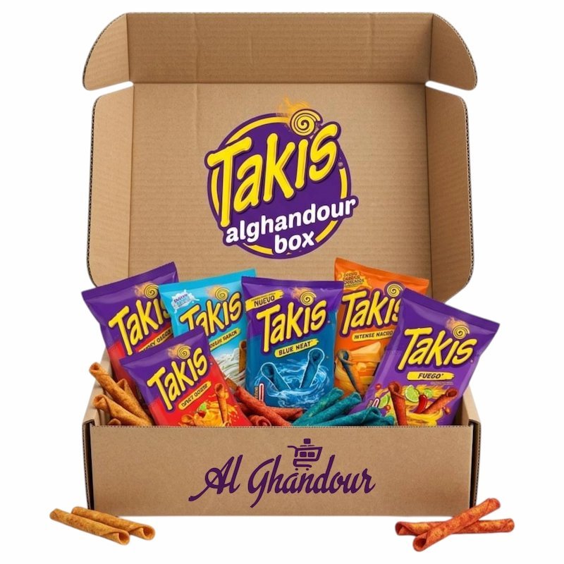 La Alghandour Box Takis Mix 5+1 Gratuit est un pack promo de chips Takis ultra piquantes avec 1 paquet offert, idéal pour les amateurs de snacks épicés. Disponible Chez Alghandour Market à Casablanca