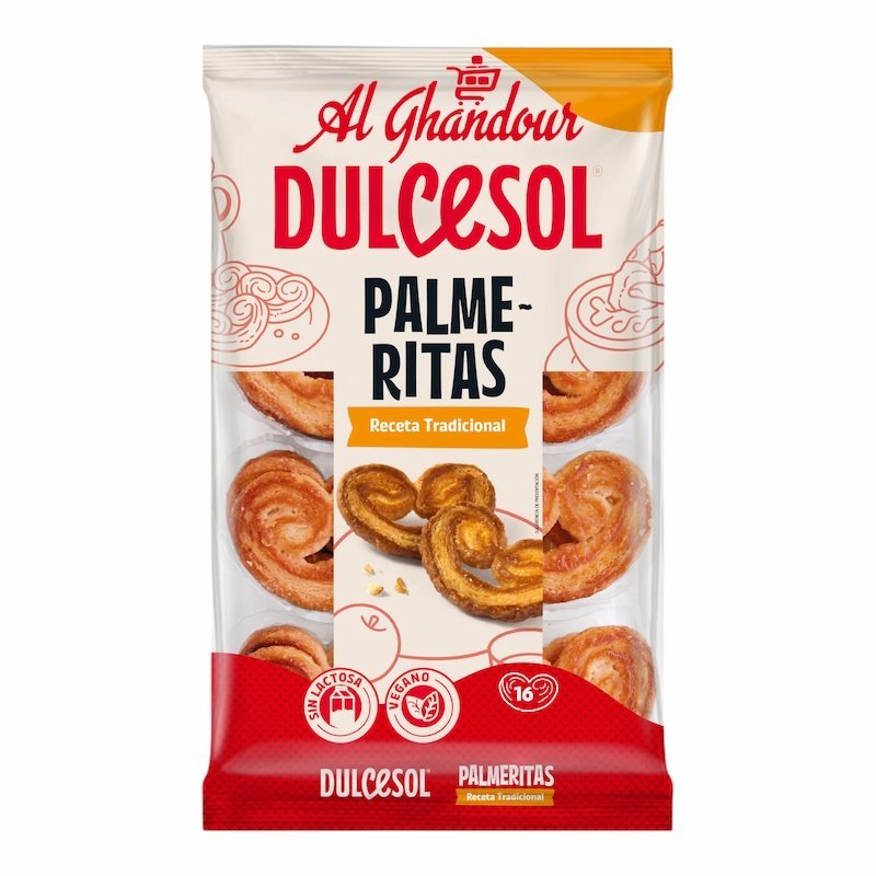 palmeritas dulcesol maroc, palmiers feuilletés maroc, dulcesol palmeritas 180 g prix maroc, snack sucré maroc, pâtisserie emballée maroc, palmiers caramélisés maroc, encas gourmand maroc.