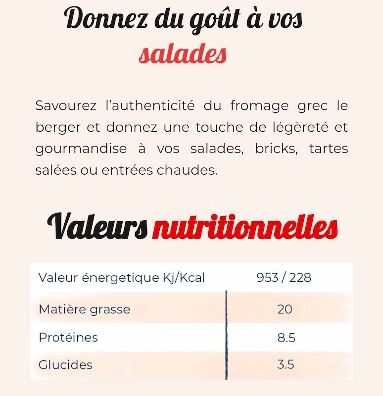 La Feta Salade Le Berger est un fromage d’origine grecque, apprécié pour sa saveur légèrement salée et sa texture tendre. Elle est idéale pour agrémenter vos salades, bricks, tartes salées ou entrées chaudes.