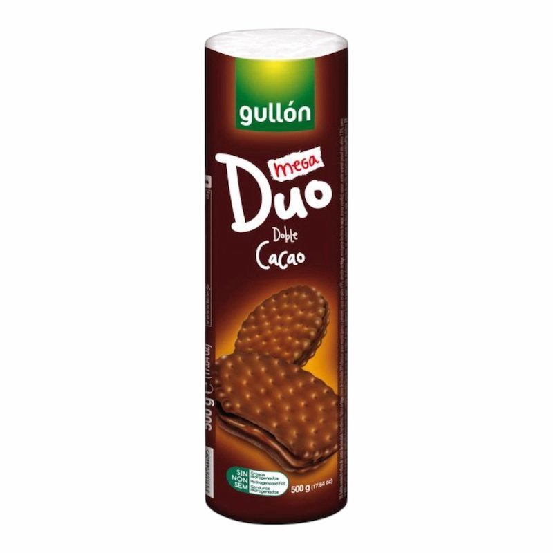 GULLON Mega Duo Cacao, biscuits GULLON, biscuits au cacao, biscuits croquants, biscuits fourrés cacao, snack chocolaté, collation sucrée, goûter cacao, biscuit double couche, Mega Duo Cacao 500g, gourmandise chocolatée.