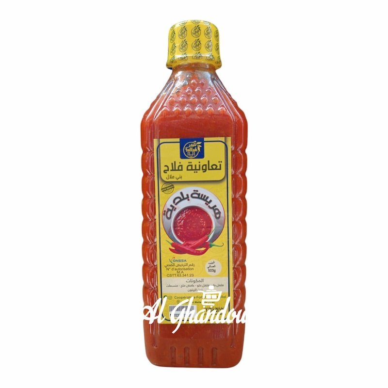 Une harissa artisanale marocaine préparée avec des piments rouges, de l’ail et des épices naturelles pour relever vos plats d’une touche authentiquement épicée.
