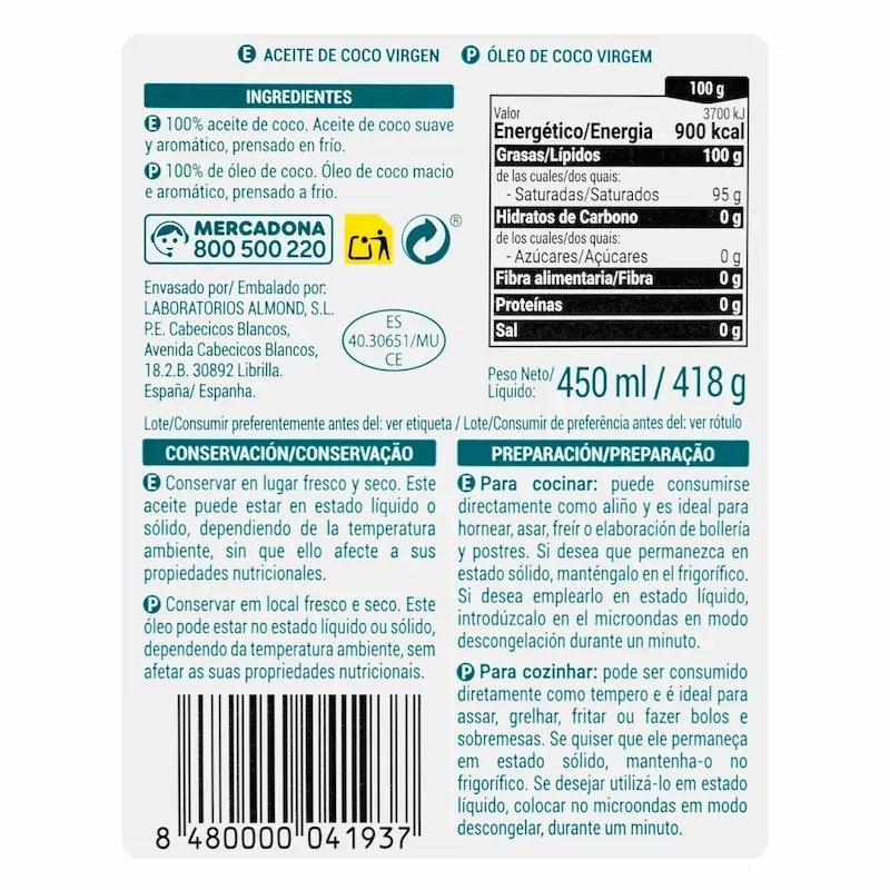 L’Huile de Coco Hacendado 450ml est une huile végétale pure, extraite de la noix de coco pour offrir une multitude de bienfaits. Idéale en cuisine comme en cosmétique, elle est un incontournable pour une alimentation saine et une routine beauté naturelle.