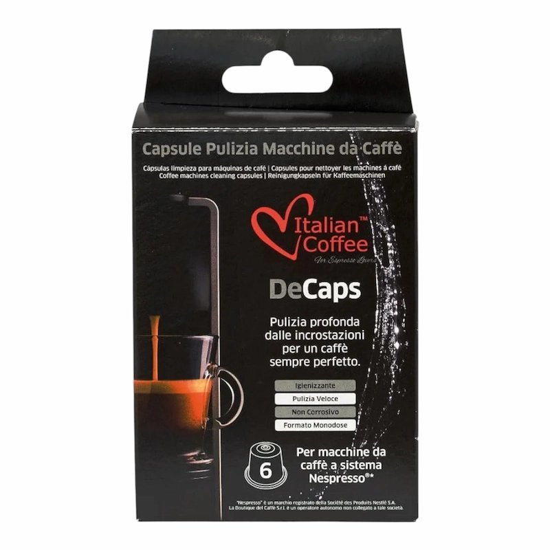 Disponible Chez Alghandour Market à Casablanca.Assurez une propreté optimale et des performances constantes de votre machine à café Nespresso avec les capsules de nettoyage Italian Coffee DeCaps, un pack pratique de 6 capsules conçu pour éliminer les résidus et le calcaire, garantissant un café toujours savoureux et hygiénique.