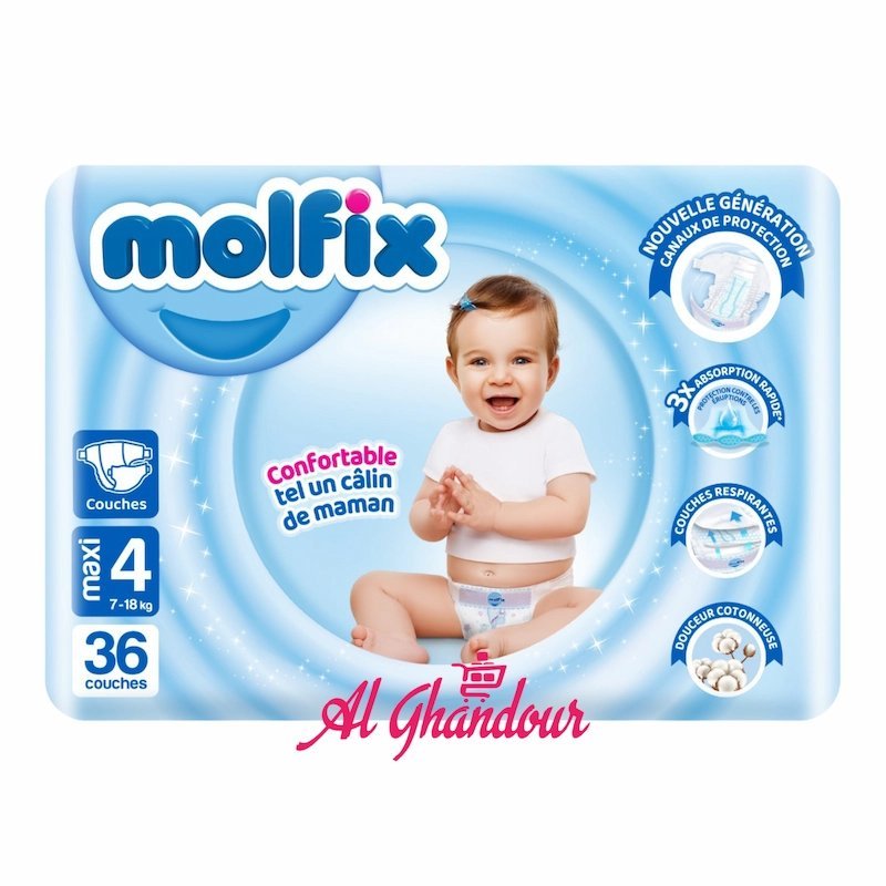 Molfix Taille 4, couches bébé 7-18 kg, couches bébé absorbantes, Molfix Maxi 36 pièces, couches confortables Maroc, couches anti-fuites, Molfix Casablanca, couches hypoallergéniques, Alghandour Market Casablanca.
