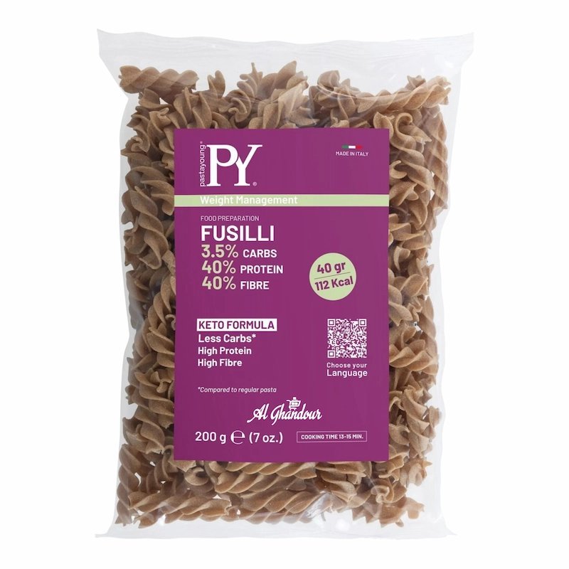 Disponible Chez Alghandour Market à Casablanca.Savourez les Fusilli Keto 200 g de Pasta Young, des pâtes torsadées riches en protéines et pauvres en glucides, parfaites pour un régime cétogène ou une alimentation équilibrée et saine.