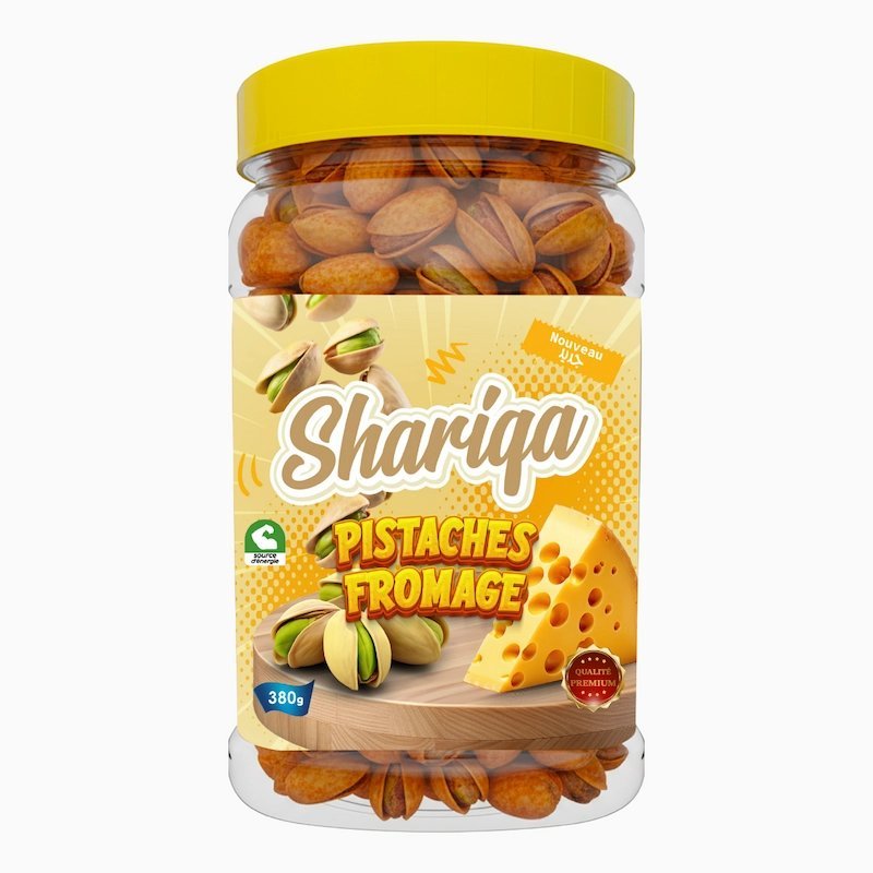 Pistaches fromage Shariqa, pistaches gourmandes, snack salé, pistaches 380g, fruits secs au fromage, snack premium Maroc, apéritif pistaches, pistaches crémeuses, collation gourmande, pistaches Shariqa Maroc.