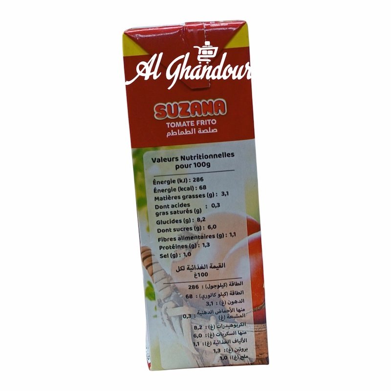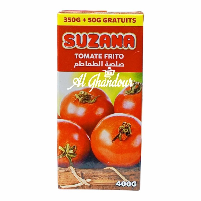 La Sauce Tomate Frito Suzana 400 g est une sauce tomate cuisinée selon une recette traditionnelle, à base de tomates mûries au soleil, doucement revenues dans l’huile pour offrir une texture onctueuse et un goût riche et équilibré. Idéale pour les pâtes, le riz, les pizzas maison et de nombreux plats méditerranéens. Disponible Chez Alghandour Market à Casablanca.