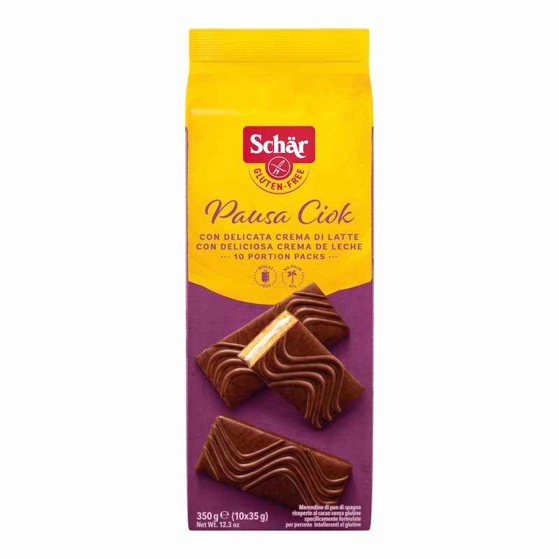 Schär Pausa Ciok est une collation sans gluten composée de deux couches de génoise moelleuse, garnie d’une délicate crème au lait et enrobée d’un glaçage croustillant au chocolat. Chaque gâteau est emballé individuellement et pèse 35 g. Le produit est généralement vendu en paquets de 10 unités, pour un total de 350 g.