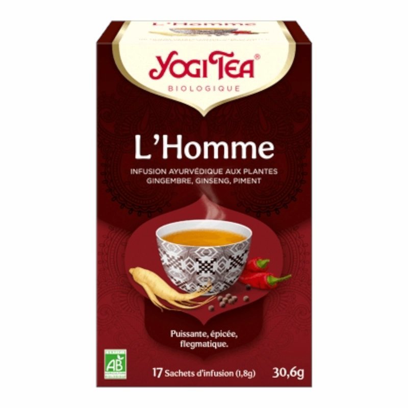 Yogi Tea L’Homme Maroc, infusion bien-être masculin, tisane ayurvédique bio, Yogi Tea 17 sachets, infusion vitalité homme, boisson santé naturelle, tisane bio énergisante, Yogi Tea Casablanca, infusion revitalisante, Alghandour Market Casablanca, boisson relaxante et tonique.